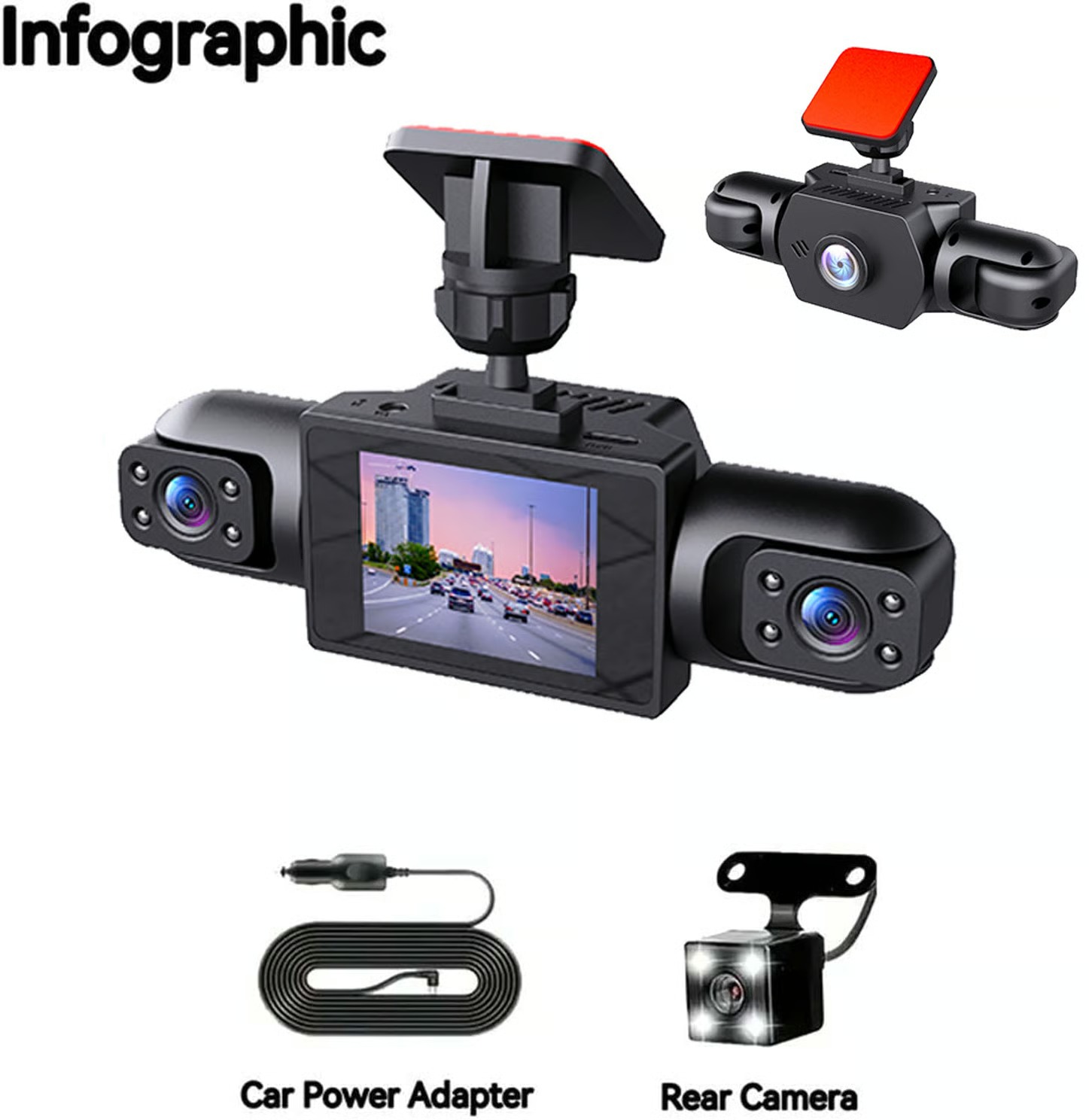 【Superior Night Vision with Interior Infrared Lights】 Drive with confidence day and night. The Sakerplus full view car camera excels in low-light conditions, capturing clear details of the road ahead. More importantly, the interior cameras feature infrared night vision, delivering sharp cabin footage even in total darkness, making it an indispensable security tool for taxi, and commercial fleet drivers.